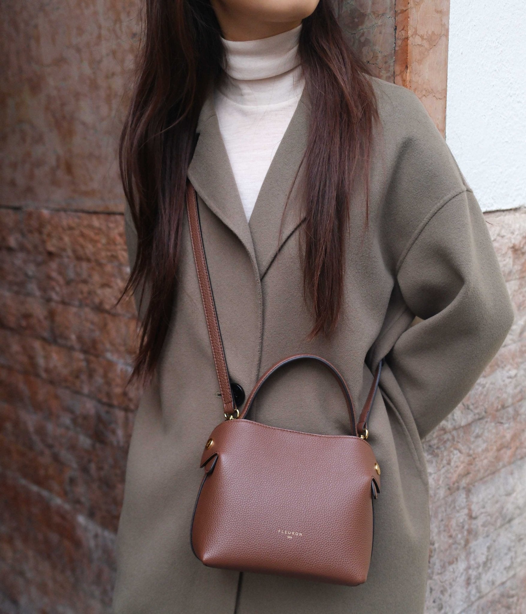 The Mini Swann in Tiramisu Grained Calfskin brings a warm, deep touch to any outfit. Its rich brown tone pairs effortlessly with neutral shades like ivory, beige, or light grey, and creates an elegant contrast with deeper hues such as camel, forest green, or midnight blue.