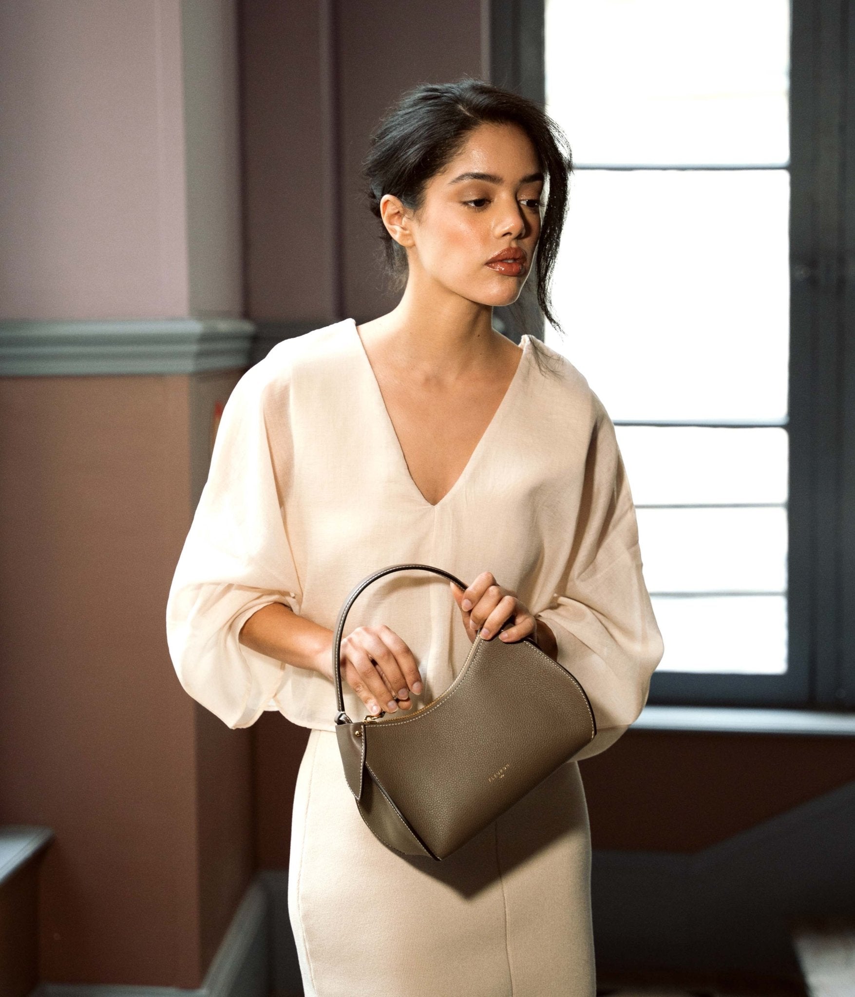 Prestigious and modern, our taupe Mini Pivoine handbag embodies timelessness with elegance.
