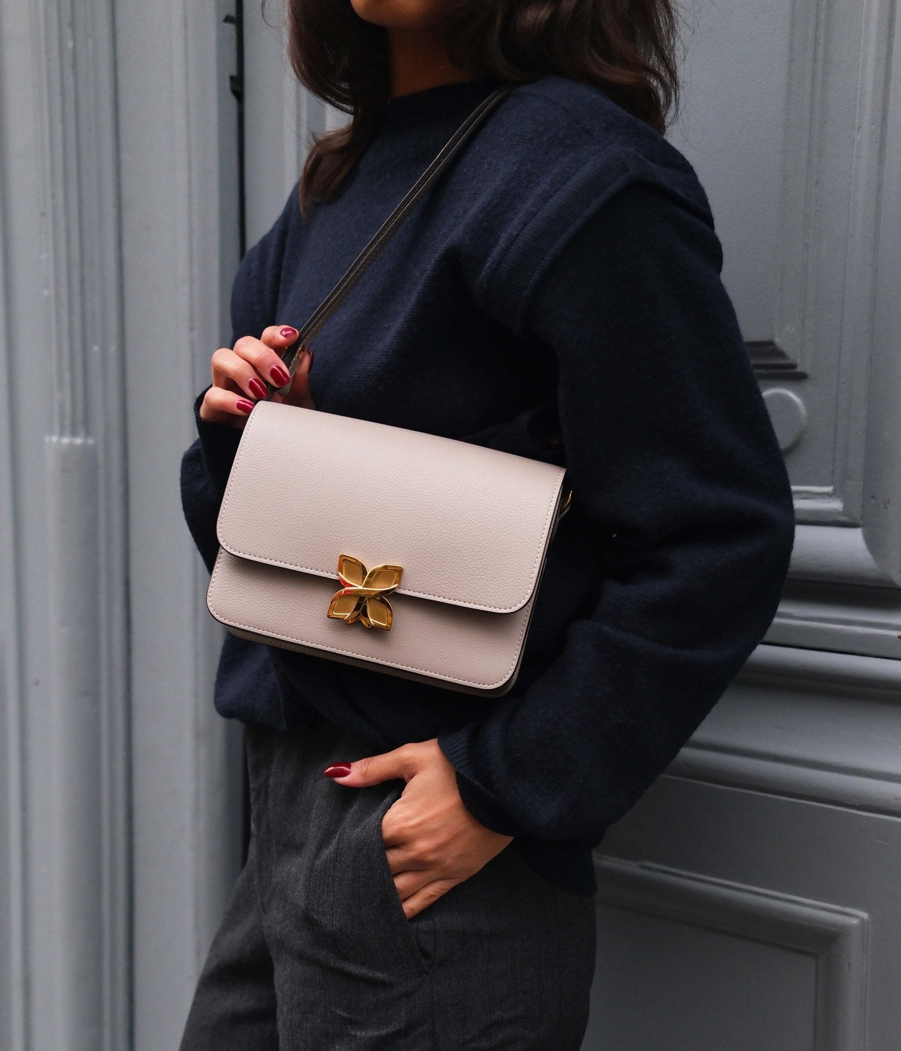 The Cachemire colour, gentle and timeless, pairs effortlessly with any wardrobe: light shades such as ivory, sand, or pearl grey enhance its finesse, while black, burgundy, or midnight blue offer a modern and sophisticated contrast. A versatile hue, designed to accompany your silhouettes throughout the year.