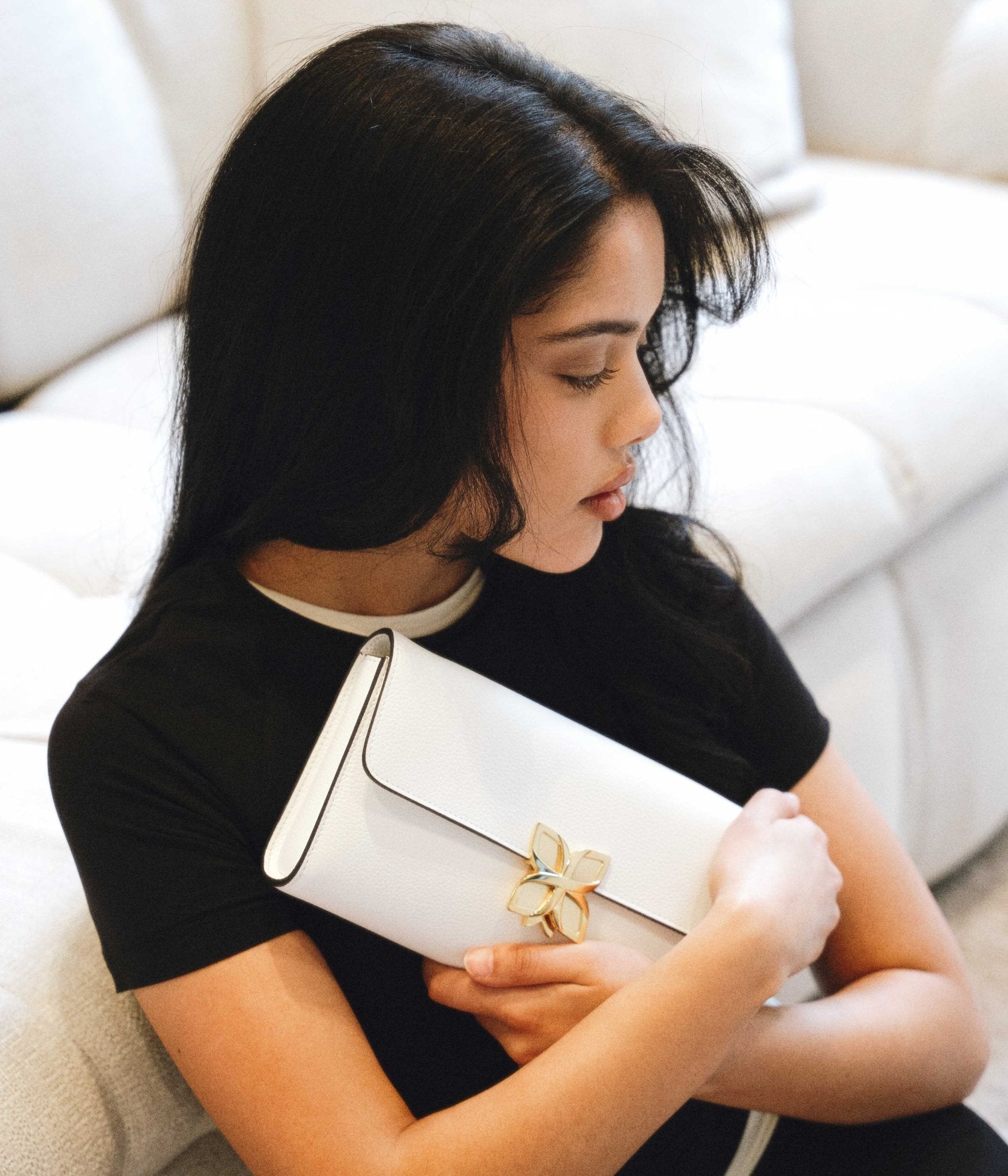 Its signature clasp, inspired by the hydrangea flower, adds a delicate and poetic finish to this clutch. The interior, designed to hold your essentials, makes it a chic and functional companion from day to night.